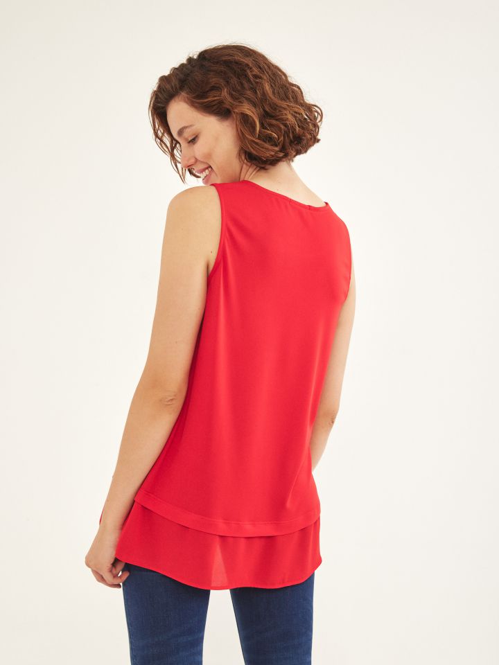 גופיה כתפיות רחבות במראה שכבות, בגזרה קרובה לגוף, באורך מותן, ניתן לשלב עם ג’ינס או מכנסיים מחוייטים להשלמת הלוק היומי.