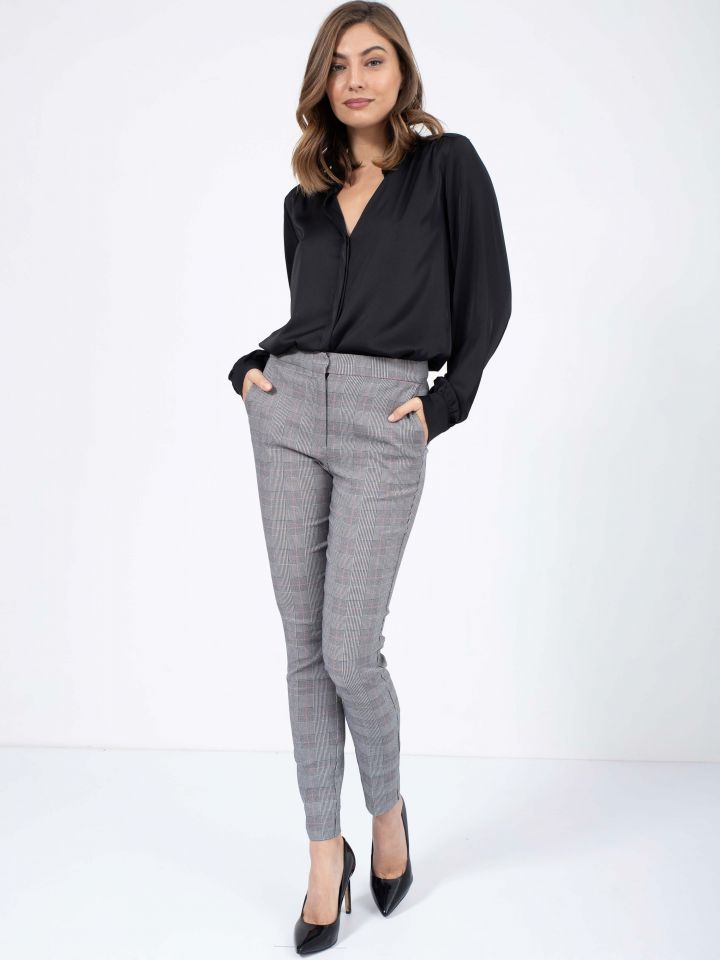 מכנסי משבצות מחויטים בגזרת סלים עם כיסי צד. סגירה באמצעות קרס פנימי ורוכסן.