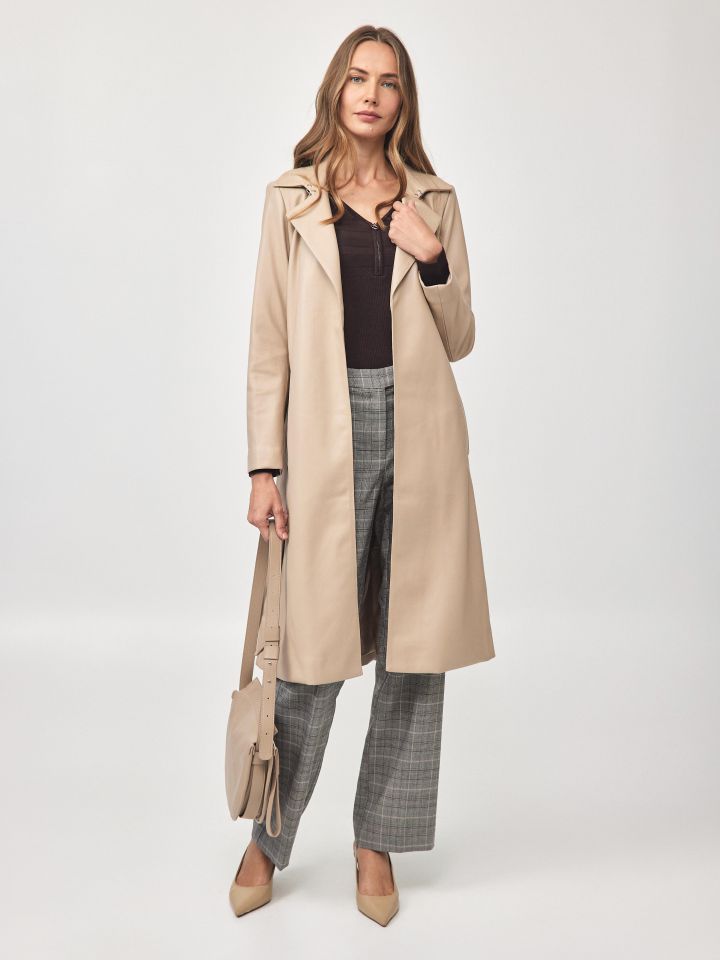 מעיל דמוי עור קשירת מותן, בגזרה קרובה לגוף ובאורך אחרי הברך. בצבע טרנדי לעונה. מתאים ללוק יום או ערב.